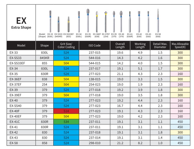 Diamond Burs – EX-11 ,Diamond Burs – EX-12 ,Diamond Burs – EX-20 ,Diamond Burs – EX-21 ,Diamond Burs – EX-24 ,Diamond Burs – EX-26 ,Diamond Burs – EX-31 ,Diamond Burs – EX-41 |