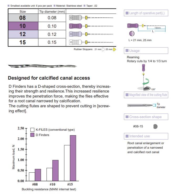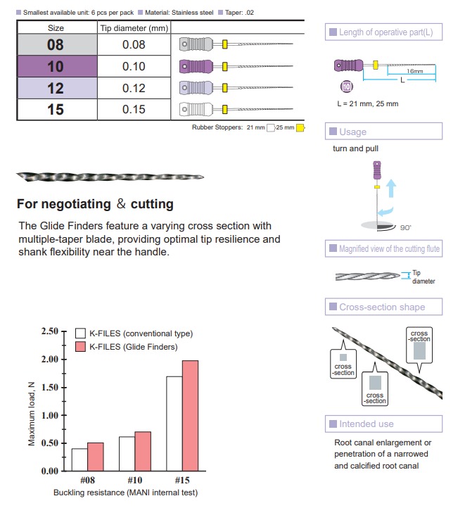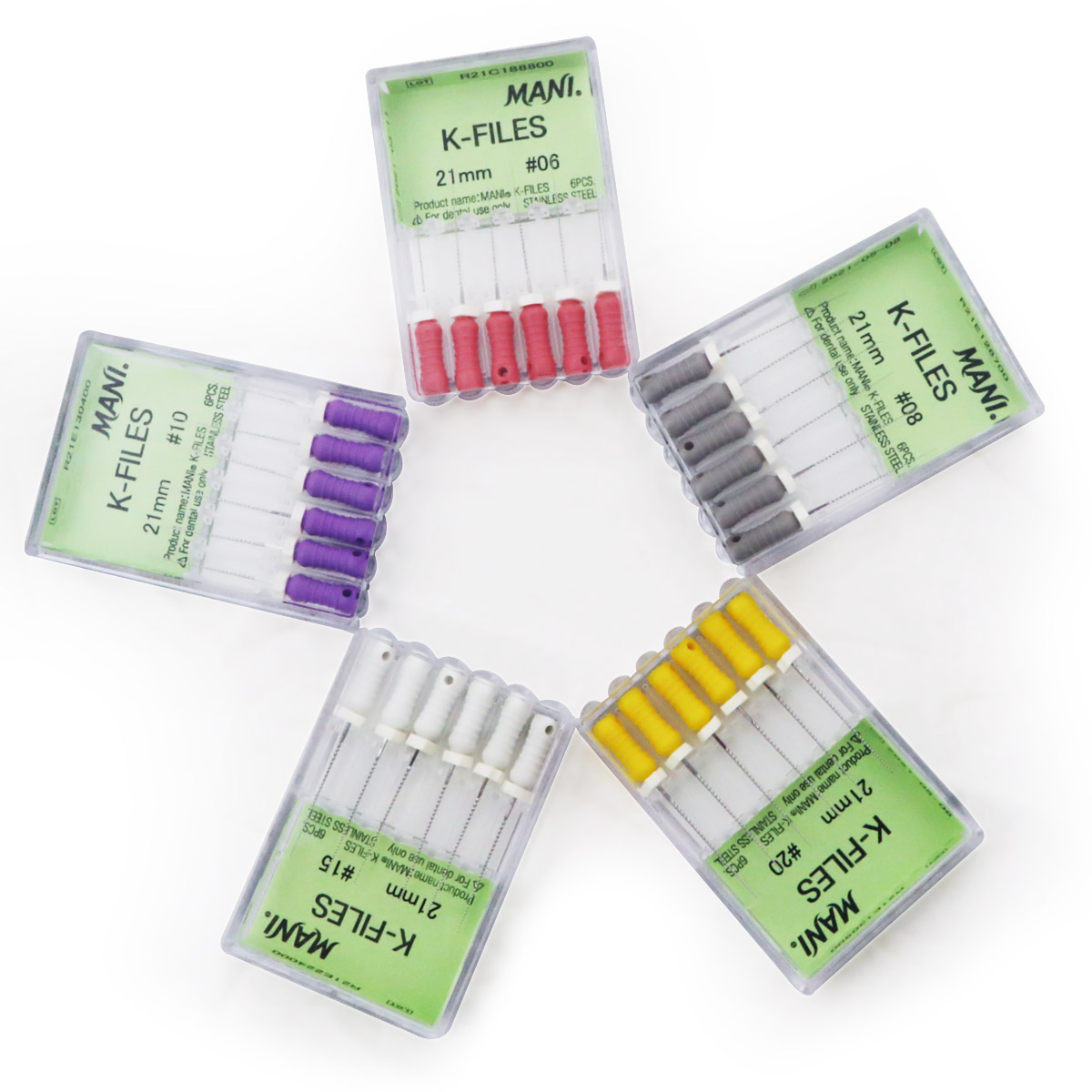 Mani K-Files 21mm are precision dental instruments designed to excel in endodontic procedures, with a particular focus on root canal treatments. Manufactured by the reputable brand Mani, these files feature a specific length of 21 millimeters, making them essential tools for dental professionals. The primary function of Mani K-Files 21mm is to facilitate the thorough cleaning and shaping of root canals. Their slender yet robust design allows dentists to access the entire length of the root canal, ensuring effective removal of debris and meticulous shaping. They are available in various sizes and tapers to cater to diverse tooth anatomies and clinical requirements, providing dentists with versatility and precision. The quality of Mani K-Files is underscored by their construction from high-quality materials, ensuring longevity and consistent performance during dental procedures. Their precision in cleaning and shaping root canals enhances the efficiency of root canal treatments. Furthermore, the files are thoughtfully designed with smooth edges, prioritizing patient comfort during the procedure. Dentists can navigate the intricate root canal system with confidence, ensuring that patients experience minimal discomfort. Mani K-Files 21mm are invaluable instruments in the hands of dentists, empowering them to achieve precise and efficient root canal treatments while prioritizing the well-being and comfort of their patients. Their quality, precision, and versatility make them a staple in the field of endodontics.