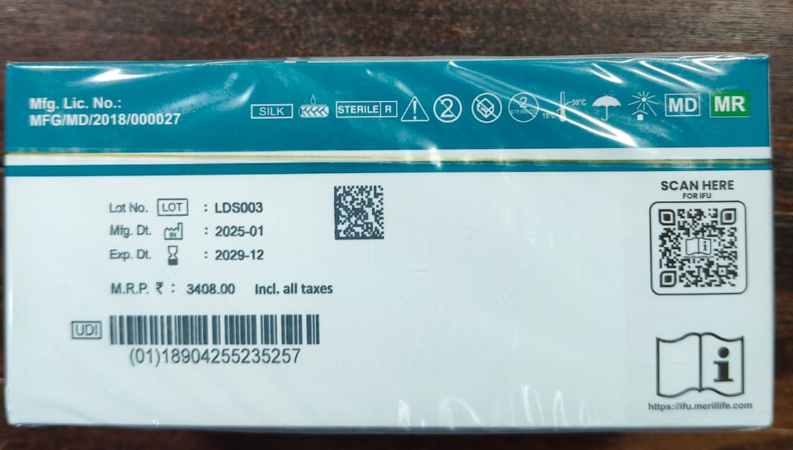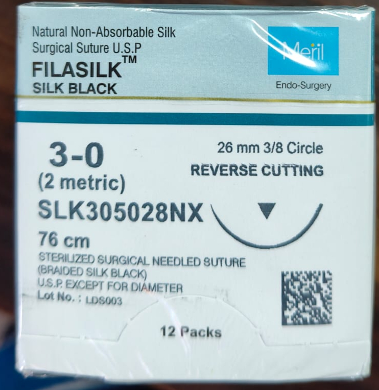 Meril Filasilk #3-0 Black Braided Silk Suture, also known as FILASILK™, is a non-absorbable, braided, and coated suture made from natural silk filaments. This suture is renowned for its excellent handling characteristics, which make it easy to use and ensure precise wound closure. The silk filaments are tightly braided to enhance the strength and flexibility of the suture, providing reliable and secure wound approximation. FILASILK™ is coated to reduce capillarity and improve smoothness during passage through tissue, minimizing tissue drag and trauma. Its black color enhances visibility during surgical procedures, aiding in accurate placement. Due to its non-absorbable nature, FILASILK™ is ideal for long-term tissue approximation and support, making it suitable for a wide range of surgical applications, including general surgery, cardiovascular surgery, and ophthalmic procedures. Meril Filasilk #3-0 suture combines the benefits of natural silk with advanced manufacturing techniques to deliver a high-performance suture that meets the demands of modern surgical practices, ensuring optimal patient outcomes.