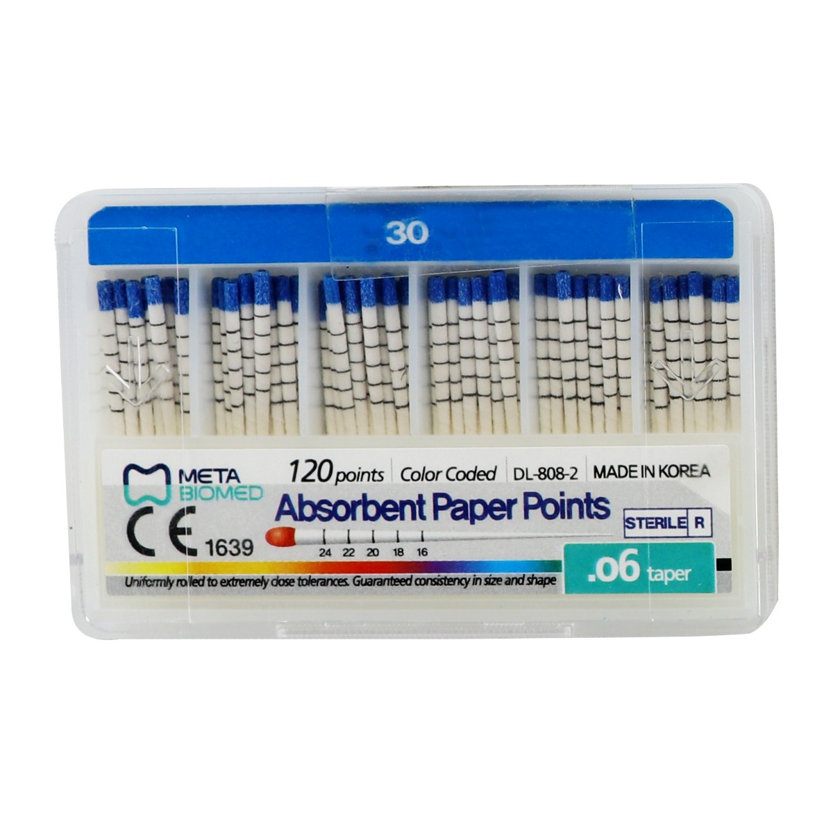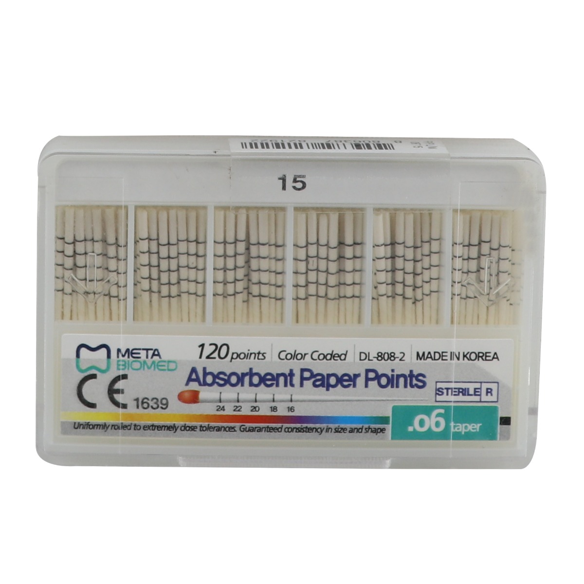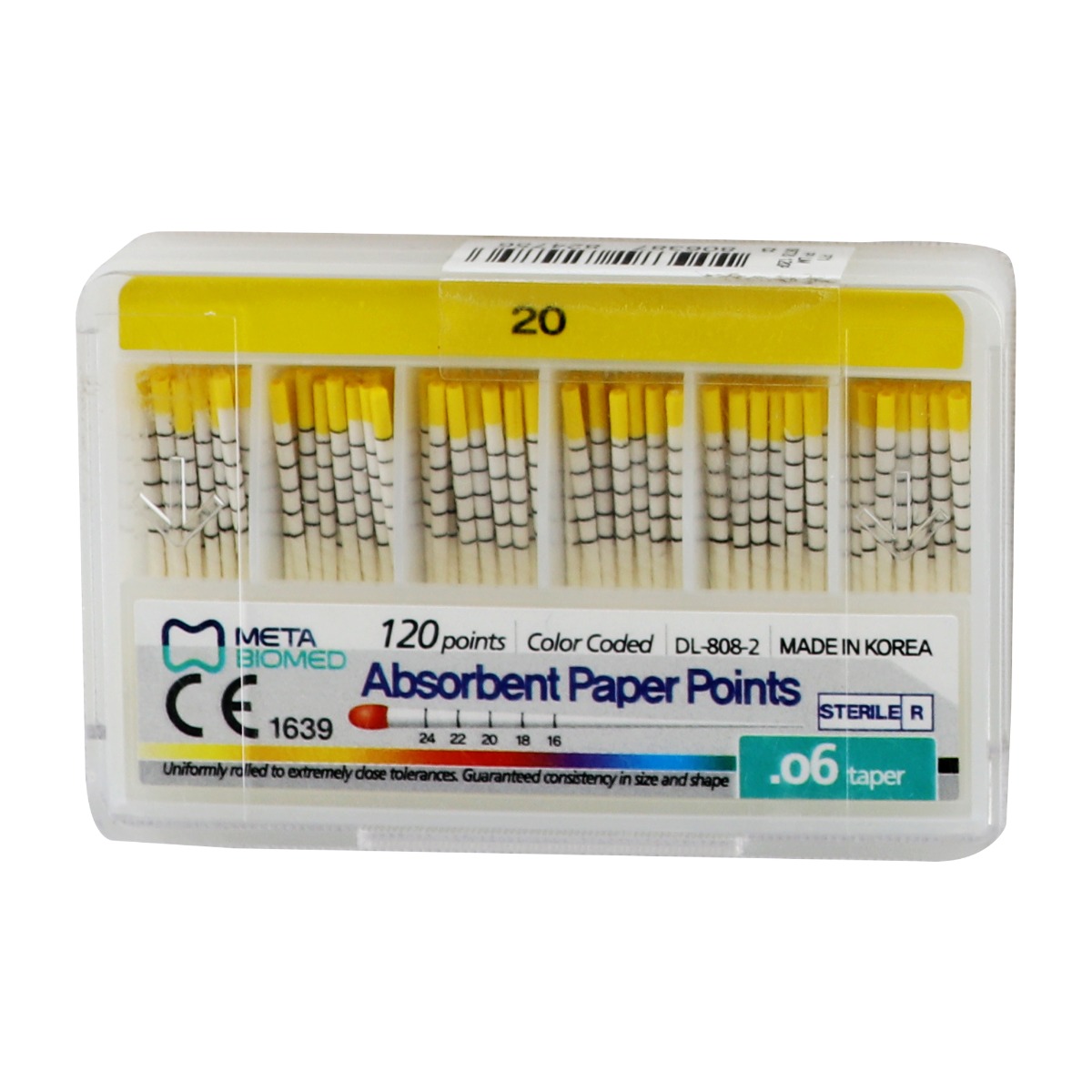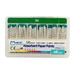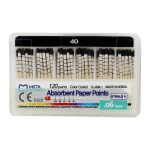 Meta Absorbent Paper Points- 6% have good absorbency and are meticulously crafted for optimal performance in root canal procedures. These paper points are color-coded for easy size identification, ensuring precise selection tailored to varying canal dimensions. The spill-proof construction guarantees a clean and controlled workspace by effectively containing absorbed fluids. Hand-rolled with care, these points strike a balance between enhanced absorbency and structural integrity, enabling efficient moisture removal without compromising rigidity. Individually sterilized packaging underscores the commitment to hygiene and safety standards. Engineered to resist curling or bending during insertion, Meta Absorbent Paper Points offer reliability and precision. With diverse sizing options, these paper points cater to a range of canal dimensions, embodying versatility to meet the nuanced needs of dental practitioners during root canal treatments.