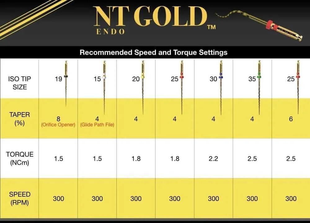 - Assorted Sizes for Versatility: The assortment of file sizes in the NT Gold Pro series caters to various canal anatomies and shapes. This versatility empowers practitioners to choose the appropriate file size for each unique case, allowing for precise and tailored root canal preparations.