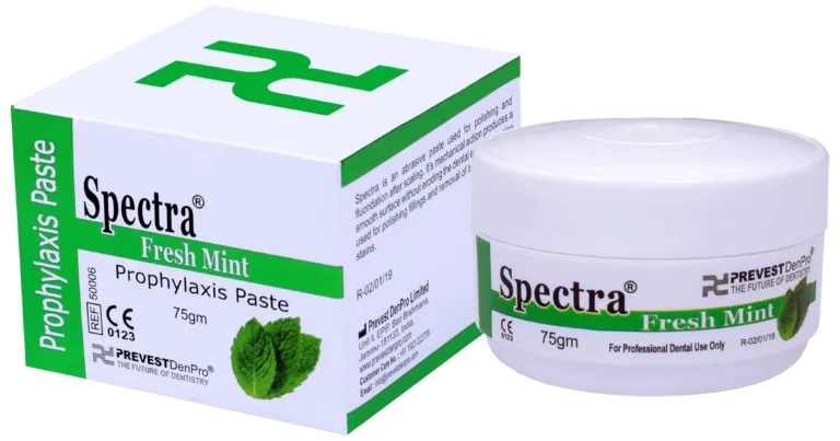 Spectra is an abrasive paste used for polishing and fluoridation after scaling. Its mechanical action produces a smooth surface without eroding the dental enamel. It is also used for polishing fillings and removal of tobacco & food stains. Spectra Minty is mint flavored that produces a fresh, pleasant tingling sensation and relieves the irritation caused by the mechanical action of the scaling.