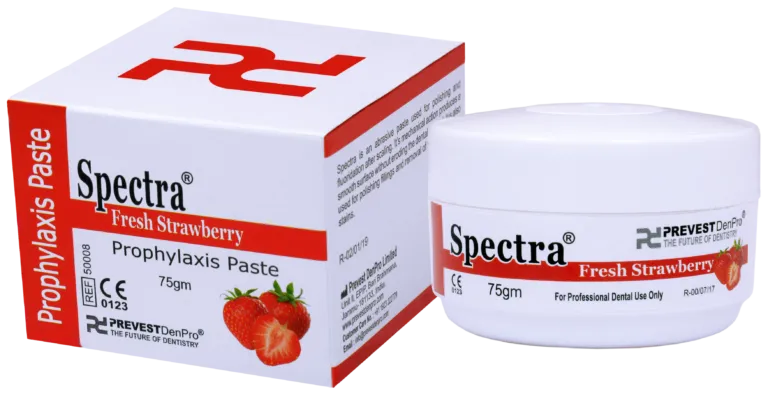 Spectra Prophylaxis Paste is a cleaning and polishing paste with a unique combination of abrasive materials zirconium silicate and pumice powder for cleaning and polishing during dental procedures. It contains sodium fluoride at a concentration of 1% fluoride ion for post treatment comfort to the patient. Spectra Prophylaxis paste is produced in a variety of fruit flavors for pleasant feeling during the treatment procedure.