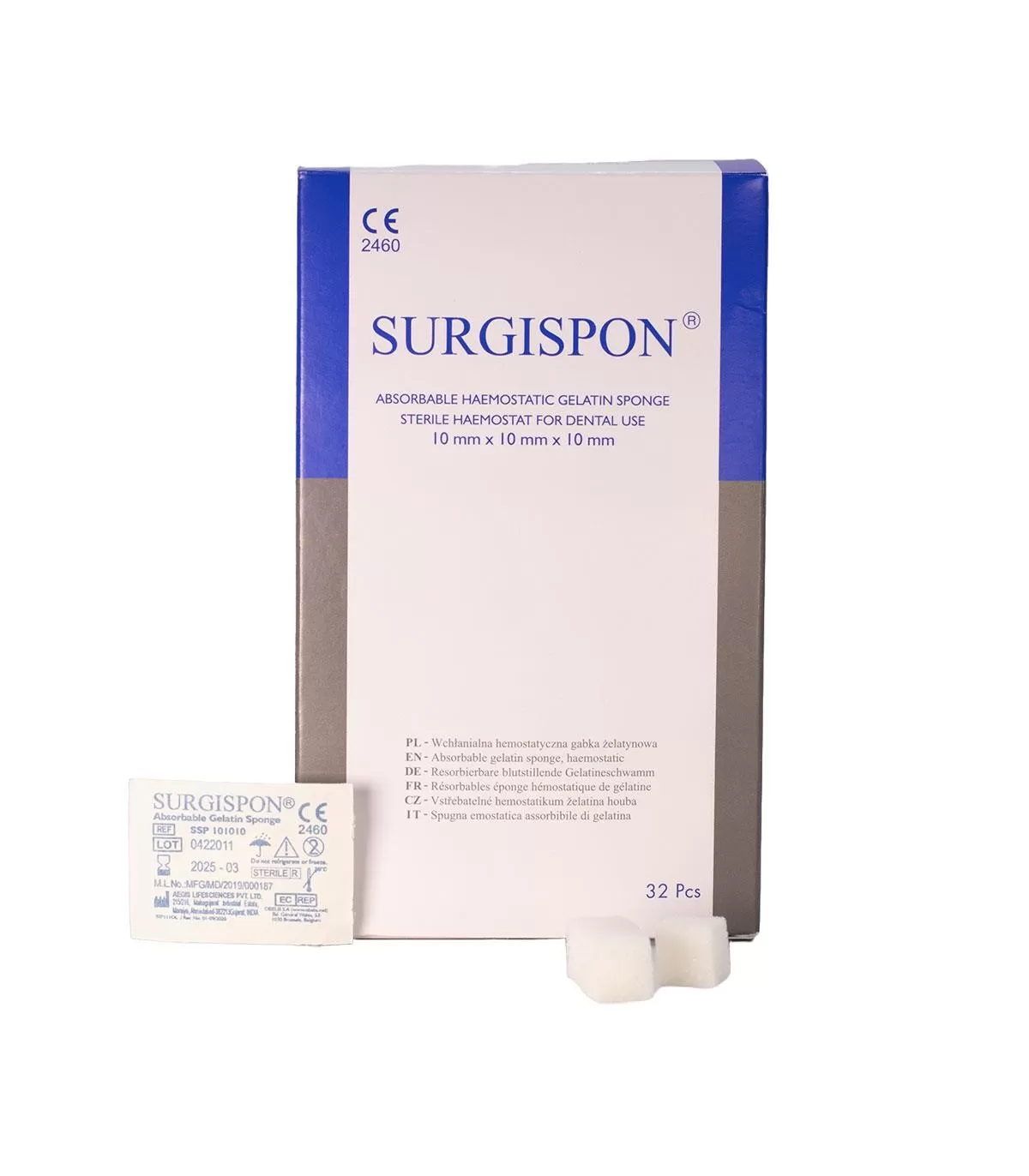 SURGISPON® Dental cube is a sterile Haemostatic absorbable gelatin sponge made of pure pharmaceutical gelatine (lyophilized hydrolyzed collagen) foam, which gives it a uniform porosity & reacts neutrally. SURGISPON® is fast and effective, having absorbability of 40-50 times its weight. It is used to achieve Hemostasis in Extractions, Oral bone, and soft tissue surgeries. ( Size: 10x10x10mm)